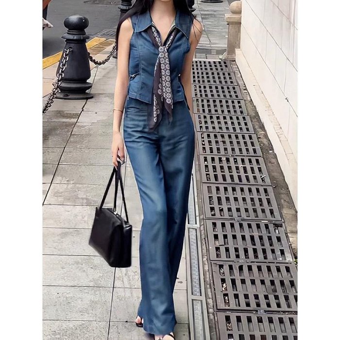 優寶購物《ubao.Tw》特貨品商城,黑貓宅配,取貨付款,韓國名媛 軟牛仔無袖襯衫+牛仔褲長褲兩件組 上下拉鍊背心 | Yahoo拍賣
