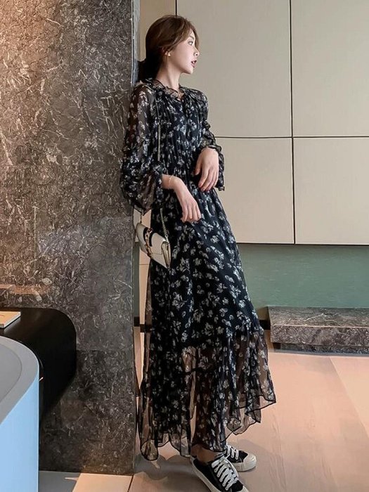 優寶購物《ubao.Tw》特貨品商城,黑貓宅配,取貨付款,黑色碎花雪紡長袖長洋裝 | Yahoo拍賣