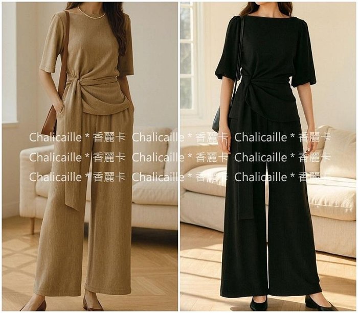 優寶購物《ubao.Tw》特貨品商城,黑貓宅配,取貨付款,Chalicaille * 香麗卡。正韓。紋路綁帶上衣鬆緊腰寬褲兩件SET 卡其綠 黑 | Yahoo拍賣