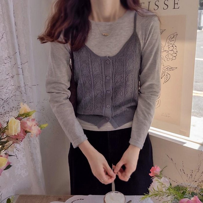 優寶購物《ubao.Tw》特貨品商城,黑貓宅配,取貨付款,Bellee 正韓 秋季浪漫柔軟彈性長袖上衣+蕾絲針織細肩背心 套裝 (2色) 【0901-2】 | Yahoo拍賣
