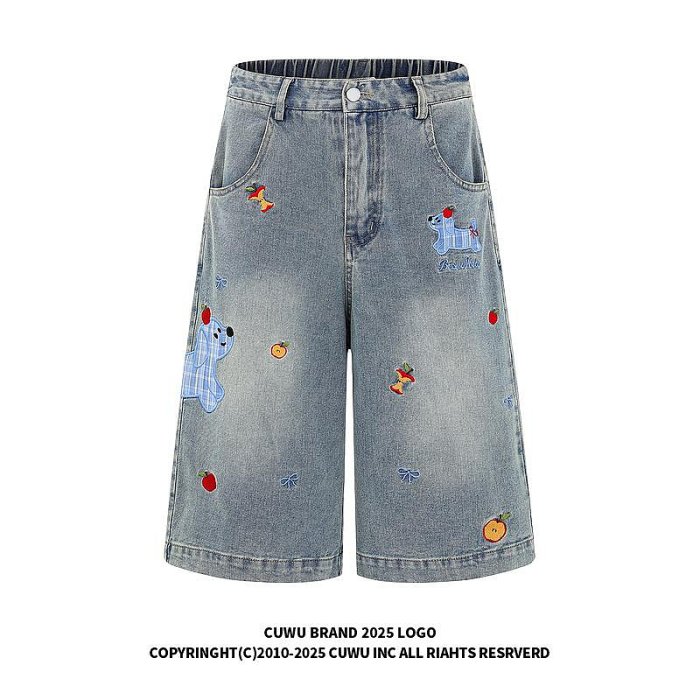 優寶購物《ubao.Tw》特貨品商城,黑貓宅配,取貨付款,新款cuwu可愛蘋果小狗刺繡牛仔七分褲女男夏季水洗寬松直筒闊腿中褲子 | Yahoo拍賣