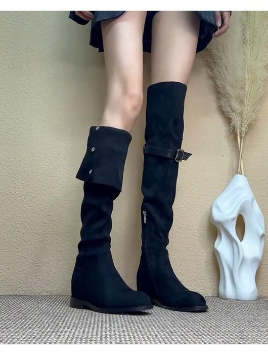 優寶購物《ubao.Tw》特貨品商城,黑貓宅配,取貨付款,LS 50911 牛皮版~內增高5CM過膝長靴女真皮絨面百搭兩穿厚底搭扣黑色騎士靴子 | Yahoo拍賣