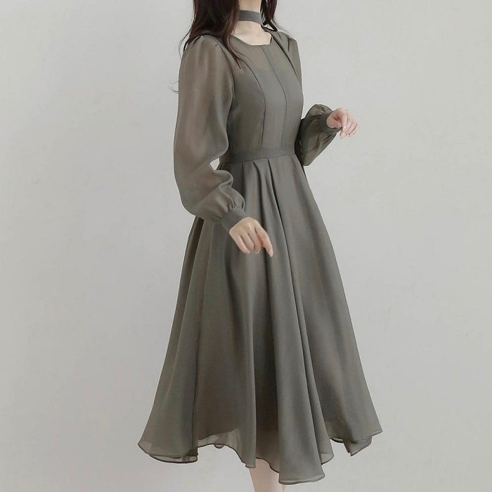 優寶購物《ubao.Tw》特貨品商城,黑貓宅配,取貨付款,正韓代購 arima.45832 圓領領巾配飾收腰雪紡洋裝 25SEP | Yahoo拍賣