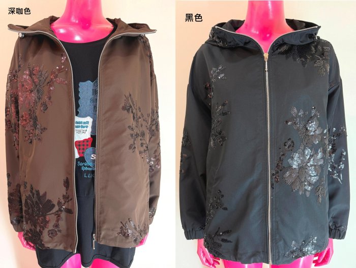 優寶購物《ubao.Tw》特貨品商城,黑貓宅配,取貨付款,鴨米衣舖中大尺碼48吋繡製亮片花樣防風布連帽長袖外套~秋裝~2色 | Yahoo拍賣