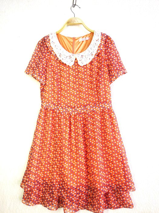 優寶購物《ubao.Tw》特貨品商城,黑貓宅配,取貨付款,*私房精選*99起標無底價*LACE專櫃 氣質橘色印花蕾絲縫珠領短袖雪紡洋裝(36號)5347 | Yahoo拍賣