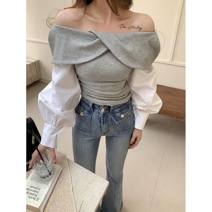 優寶購物《ubao.Tw》特貨品商城,黑貓宅配,取貨付款,【熱銷】純欲一字領露肩襯衫女2024早秋新款假兩件拼色泡泡袖ins顯瘦上衣 | Yahoo拍賣