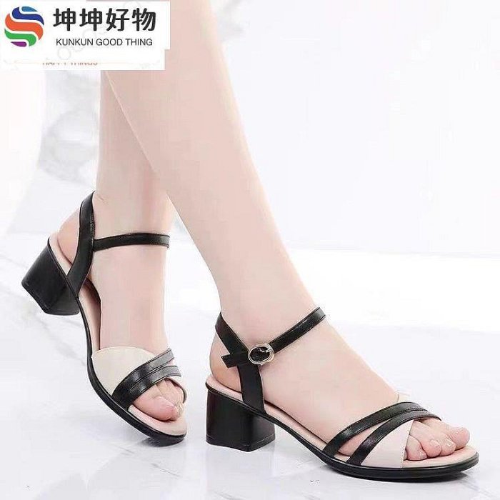 優寶購物《ubao.Tw》特貨品商城,黑貓宅配,取貨付款,夏季新款女士涼鞋皮面時尚拼色粗跟女鞋休閑一字帶中跟媽媽涼鞋~坤坤好物~ | Yahoo拍賣