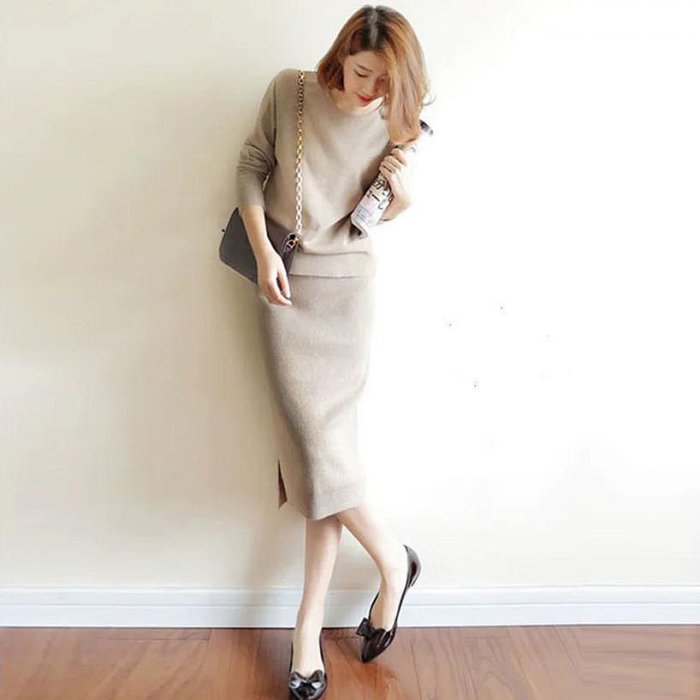 優寶購物《ubao.Tw》特貨品商城,黑貓宅配,取貨付款,韓國名媛針織圓領長袖上衣+長裙兩件式套裝3色及膝裙 | Yahoo拍賣
