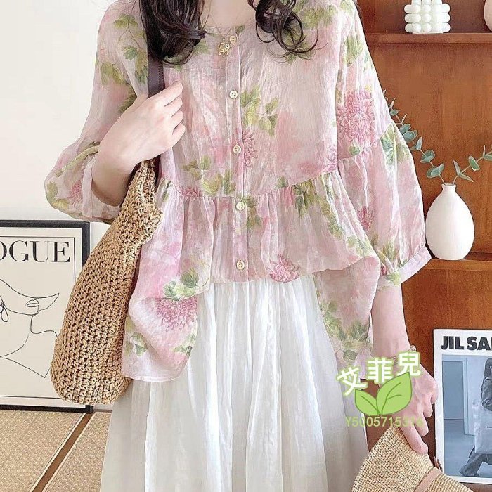 優寶購物《ubao.Tw》特貨品商城,黑貓宅配,取貨付款,艾菲兒=娃娃衫上衣女夏款2025新款寬松甜美圓領燈籠袖蓬蓬碎花七分袖襯衫 | Yahoo拍賣