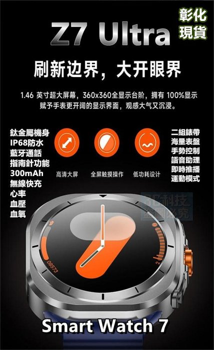 優寶購物《ubao.Tw》特貨品商城,黑貓宅配,取貨付款,Z7 Ultra藍牙通話智能手錶 AI助手 1.46AMOLED 鈦金屬機身 IP68防水 100種運動模式 心率 血壓 血氧 多錶盤切換 無線充 長續航 配2 | Yahoo拍賣