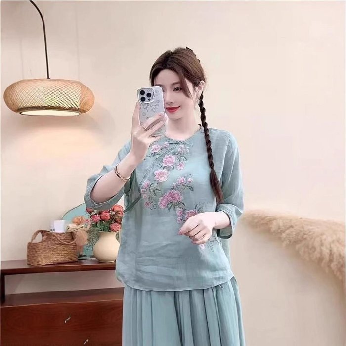 優寶購物《ubao.Tw》特貨品商城,黑貓宅配,取貨付款,洋裝 中式 復古 女國風夏季新款棉麻復古斜襟中式襯衫文藝盤扣茶服刺繡七分寬松上衣 | Yahoo拍賣