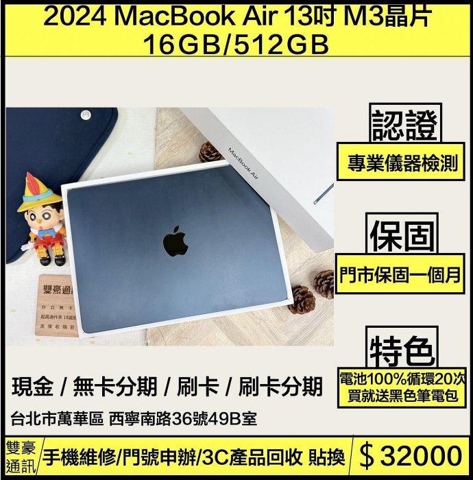 優寶購物《ubao.Tw》特貨品商城,黑貓宅配,取貨付款,2024 MacBook Air 13吋 M3晶片 16GB/512GB SSD 循環20次 電池100% 極新!! 附贈黑色筆電包 有盒裝有配 | Yahoo拍賣