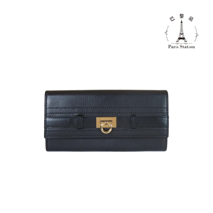 優寶購物《ubao.Tw》特貨品商城,黑貓宅配,取貨付款,【巴黎站二手名牌專賣店】*現貨*Salvatore Ferragamo 真品*黑色皮革玫瑰金釦式長夾 | Yahoo拍賣