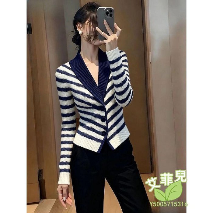 優寶購物《ubao.Tw》特貨品商城,黑貓宅配,取貨付款,艾菲兒=藍色條紋針織上衣女秋高端小眾不撞款獨特漂亮超好看氣質掐腰毛衣 | Yahoo拍賣