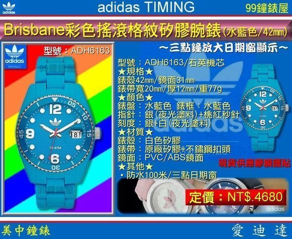 優寶購物《ubao.Tw》特貨品商城,黑貓宅配,取貨付款,【99鐘錶屋】adidas Timing:《 彩色搖滾格紋矽膠腕錶-水藍色/日期/夜光/42㎜》(ADH6163) | Yahoo拍賣