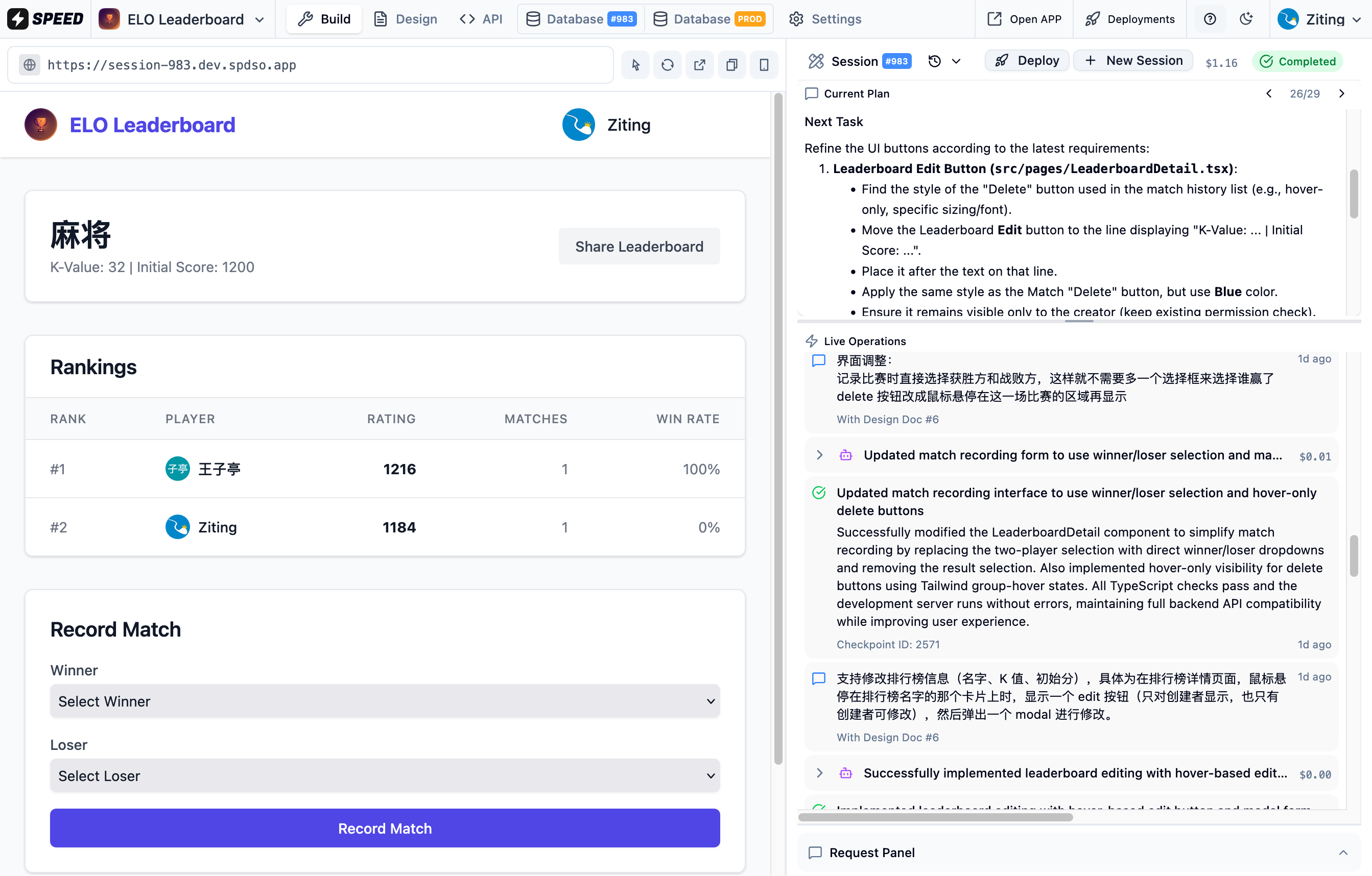 这给了 Speed.so 一个非常不同的定位 它不是给程序员的辅助开发工具,而是一个快速把有趣的想法实现,并分享给朋友的「小程序」平台。就比如说我们这里有个乒乓球台,我想做一个大家都可以添加比赛记录的排名系统,于是只花了不到一个小时(包括测试和改进)就做了一个包含前后端、数据库、登录,甚至是多租户的这样一个 ELO 排名系统(Demo)。