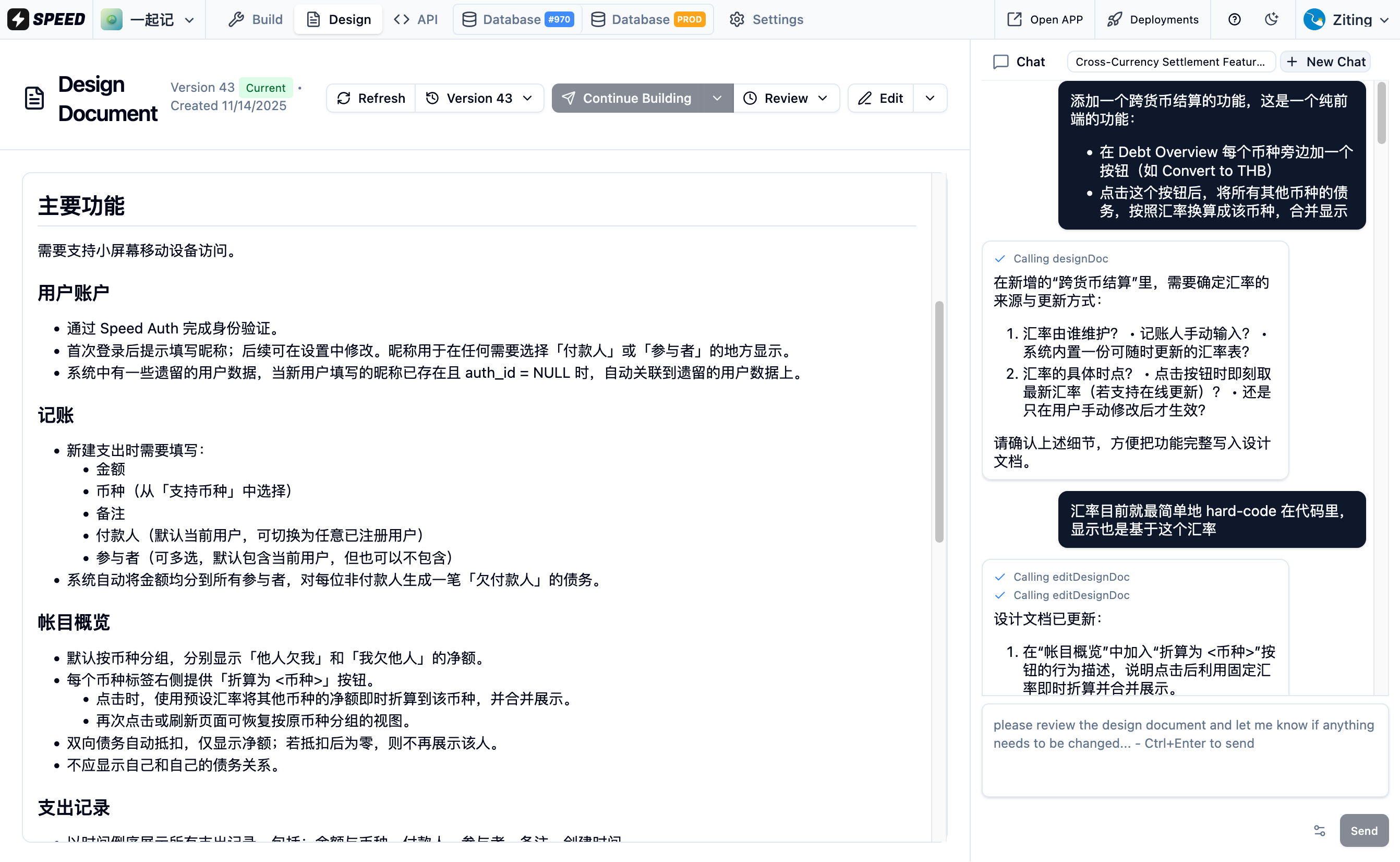 或者,也许 AI 时代真正的「源代码」应该是你发送过的所有指令才对,所以我们还提供了一个 Design Doc 模式,前面通过传统聊天方式发送的指令会被自动同步进 Design Doc 。当然你也可以直接修改 Design Doc ,在修改后 LLM 可以根据改动部分的 diff 去实现改动: