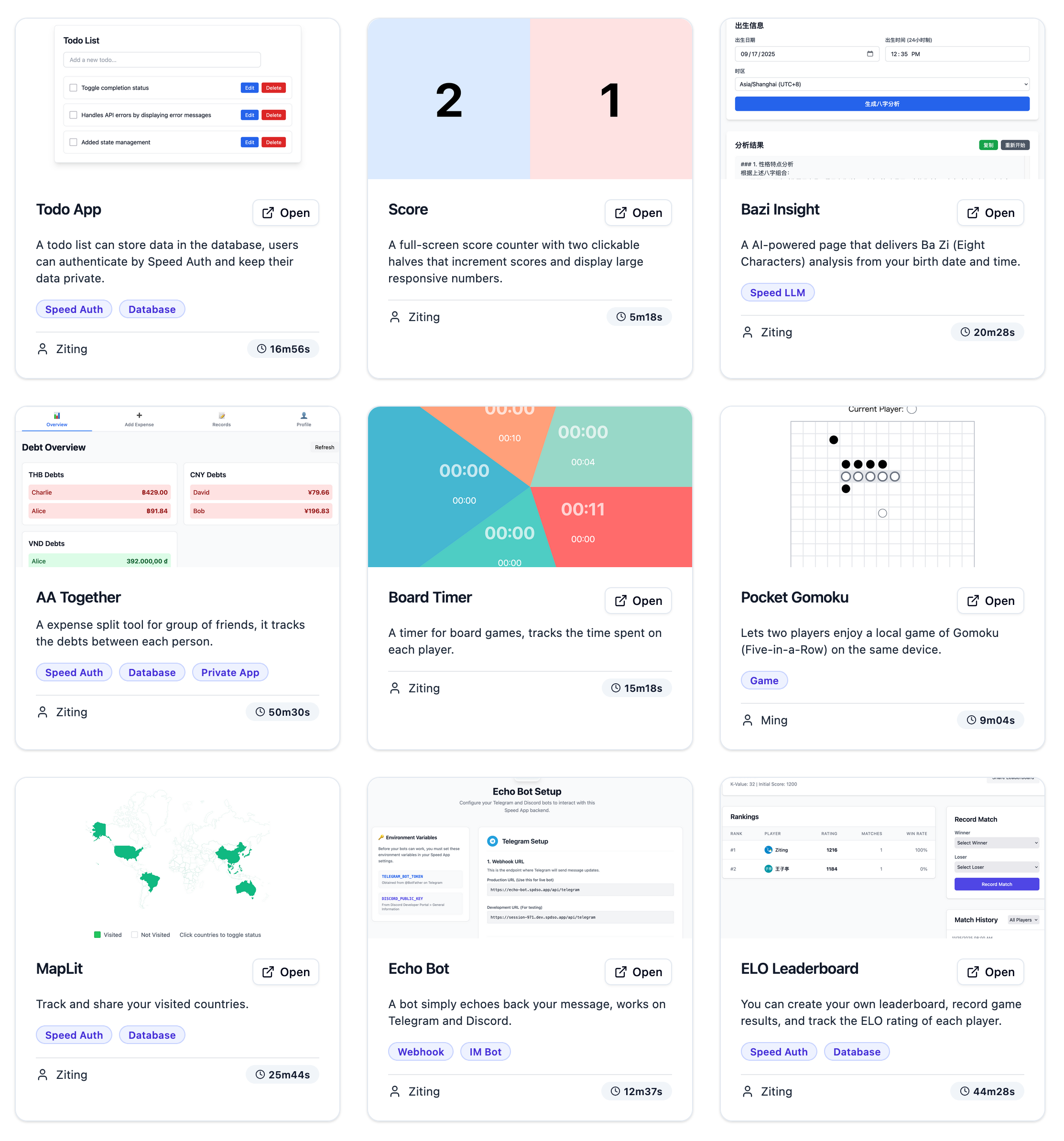 https://speed.so/?inviteCode=TSDA71HL https://speed.so/?inviteCode=0VC4J3UG https://speed.so/?inviteCode=RHBLUFP9 https://speed.so/?inviteCode=5HQSR1TH https://speed.so/?inviteCode=HG0999Q0 或者也可以加入我们的 Discord 群组来获取额度和更好地交流,也欢迎把有趣的小程序提交到 Gallery:
