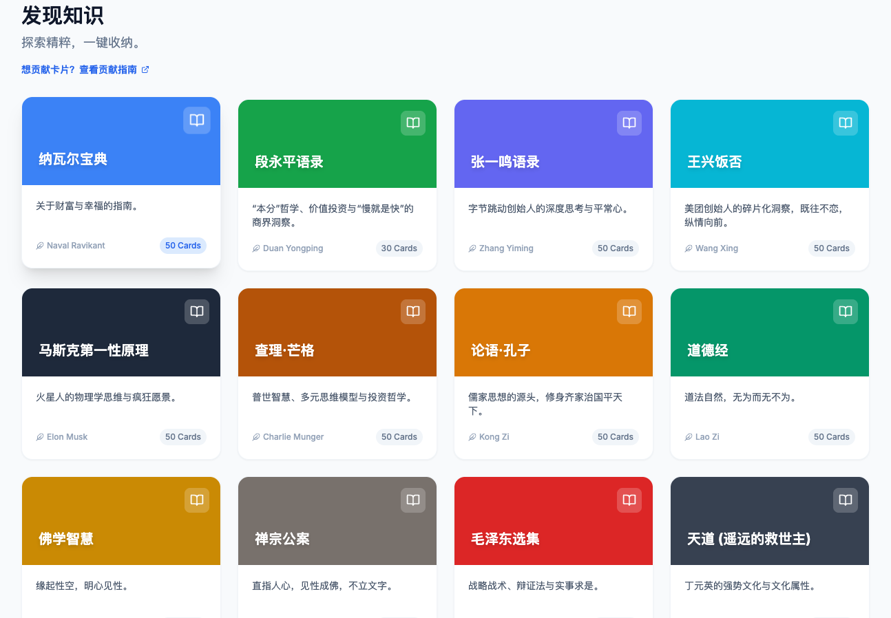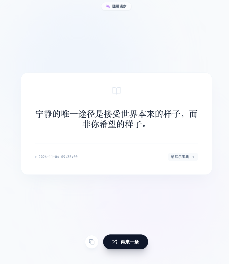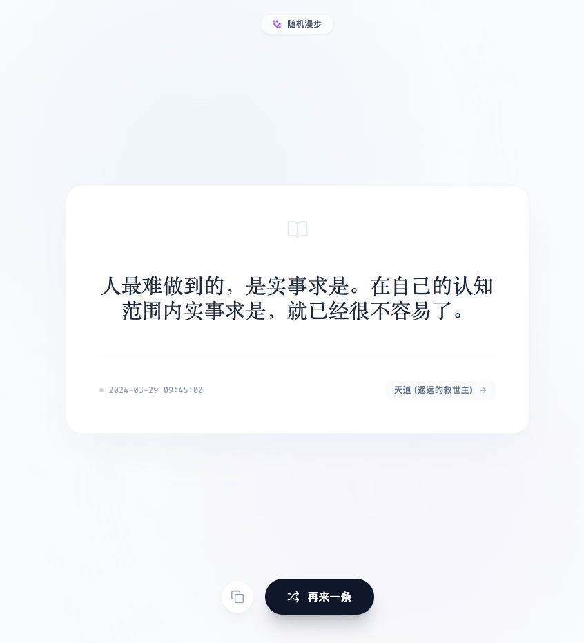 当你点击那个骰子图标,或者直接访问这个页面时,屏幕上只会为你展示一张随机抽取的智慧卡片。它可能是一句纳瓦尔的商业洞察,一句查理芒格的普世原则,也可能是一段新上线的王阳明心学精华。