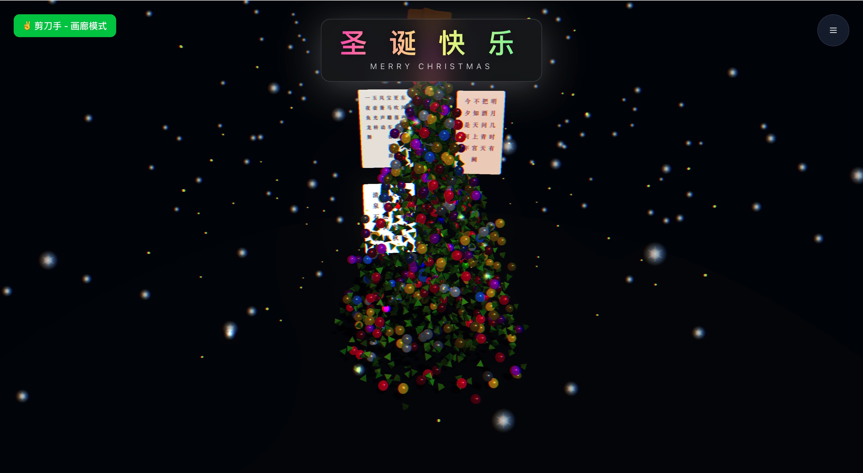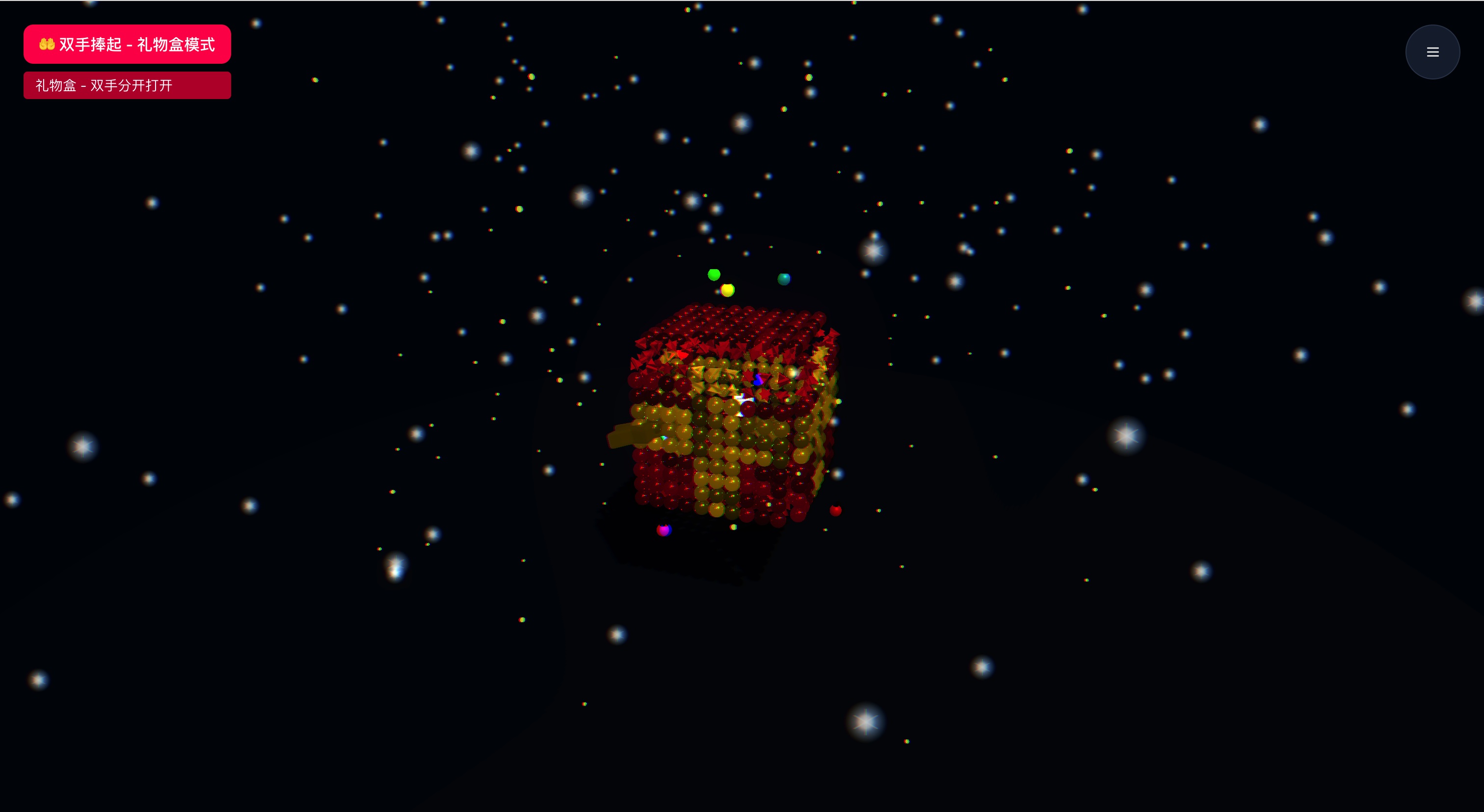 玩法:打开摄像头,做出、等手势,就能让粒子聚合成树、散开旋转甚至开启派对模式。你还可以上传照片,让它成为场景的一部分。