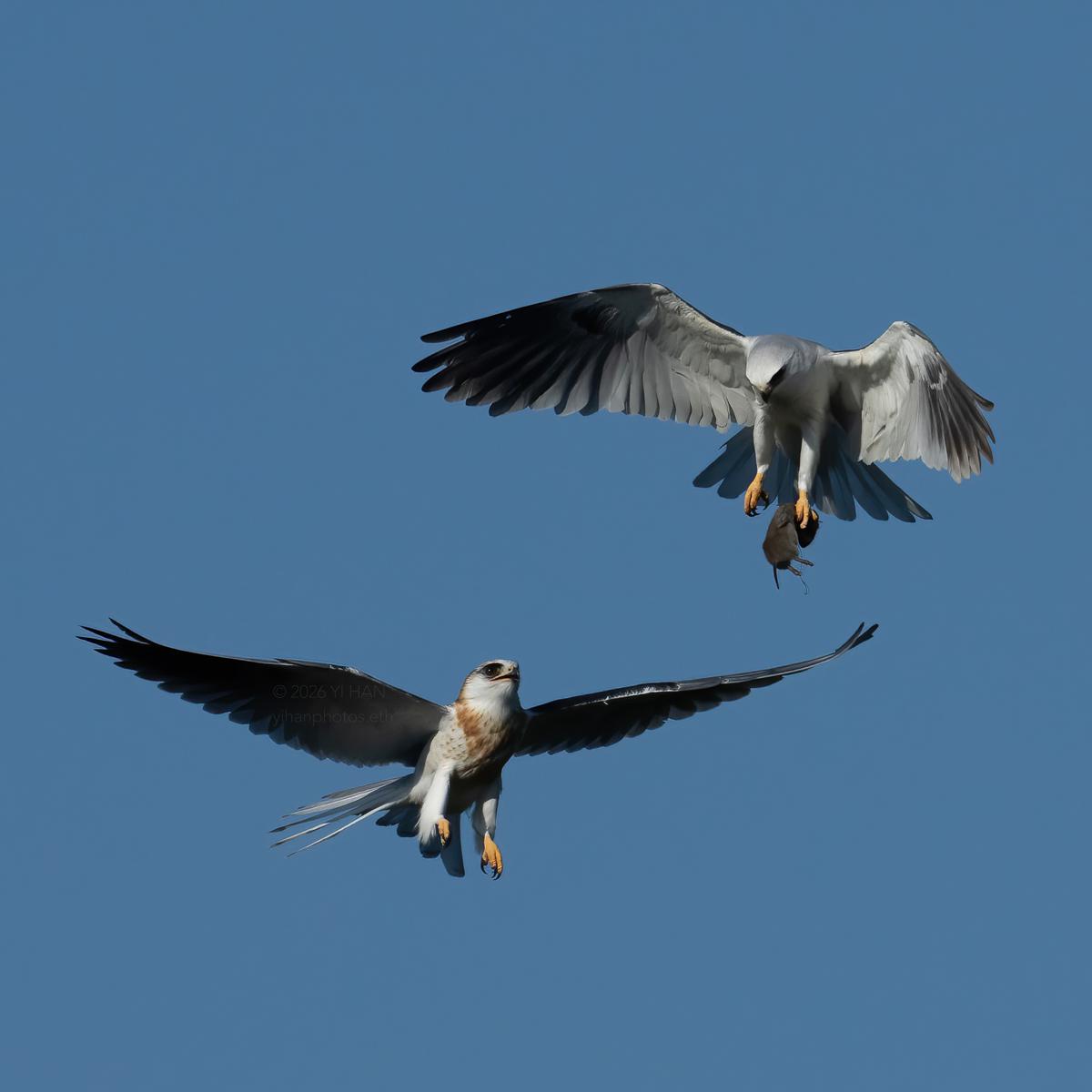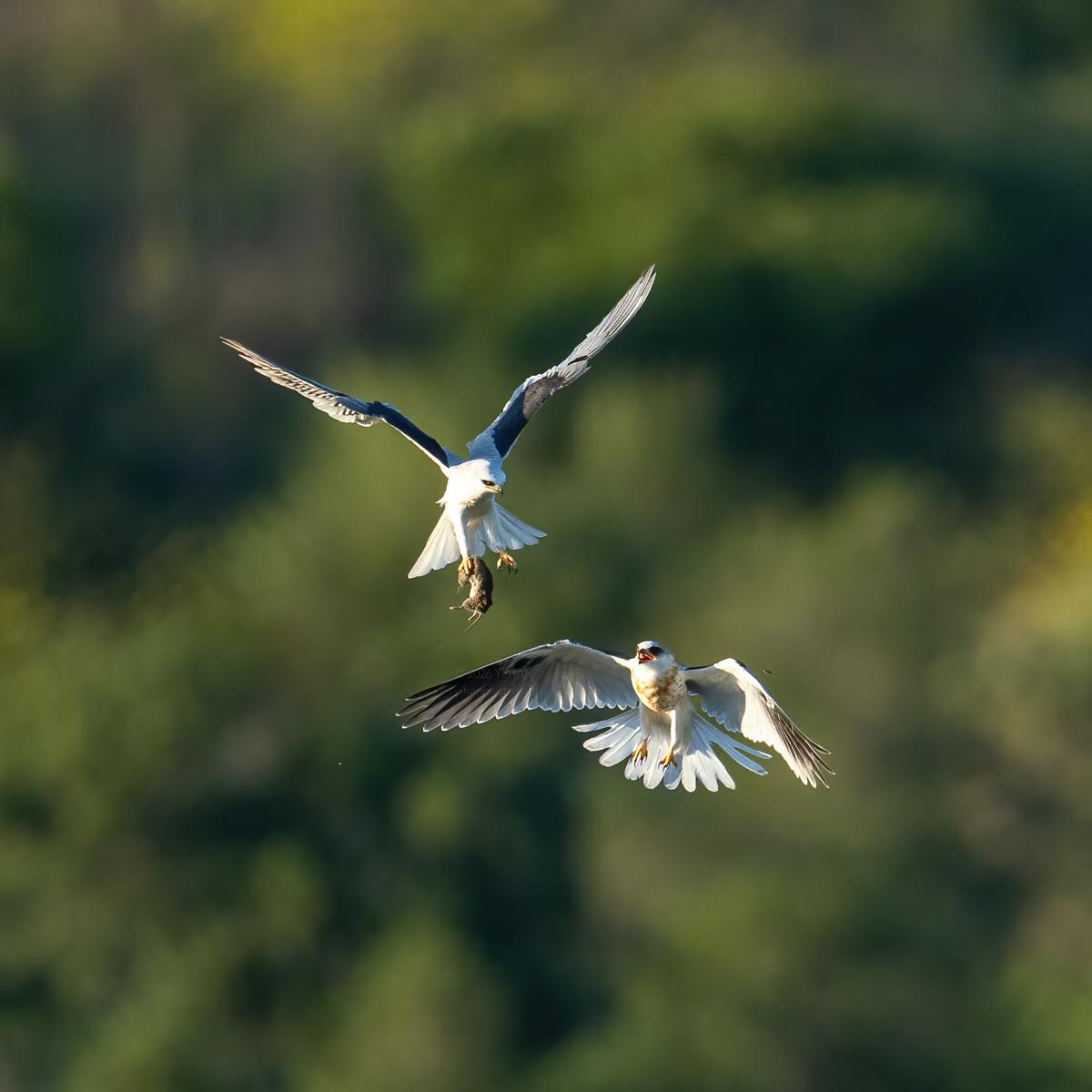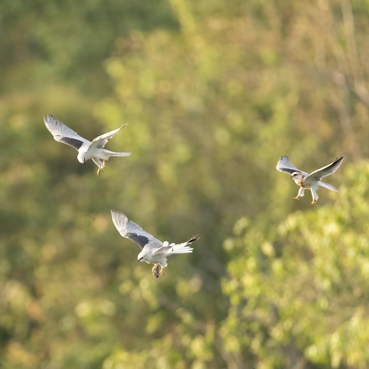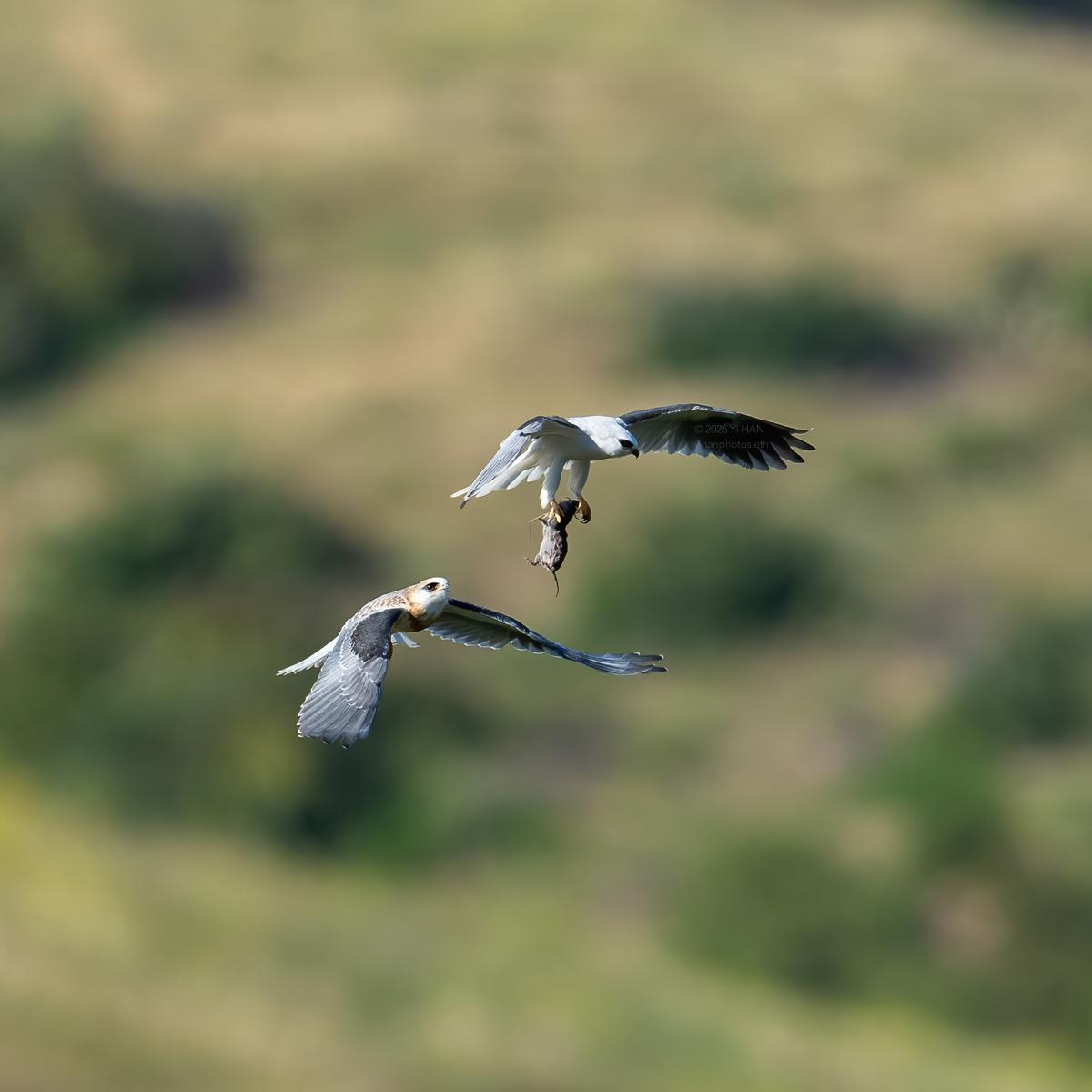 白尾鸢的公鸟繁殖季给母鸟送食物,育雏早期都是空中交接,食物通常是鼠鼠类。