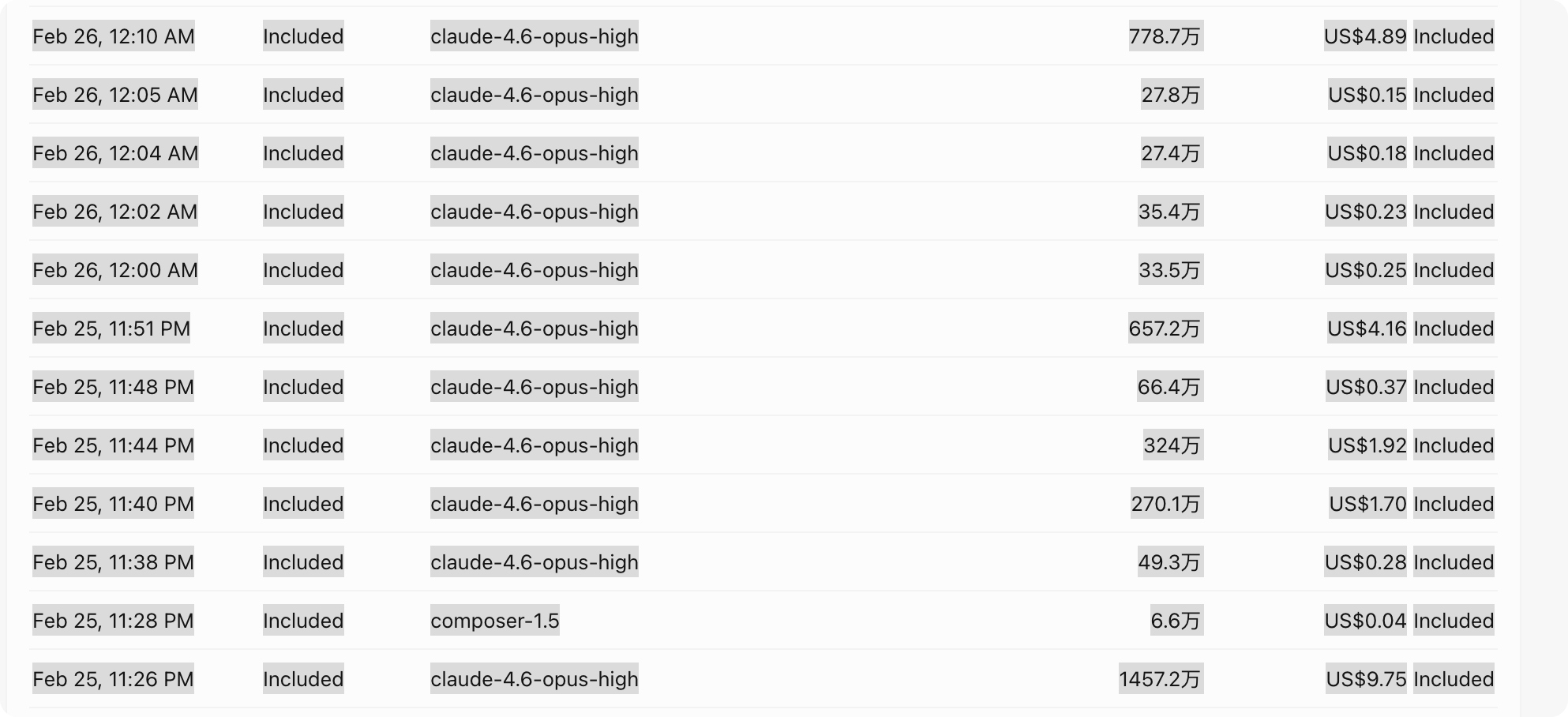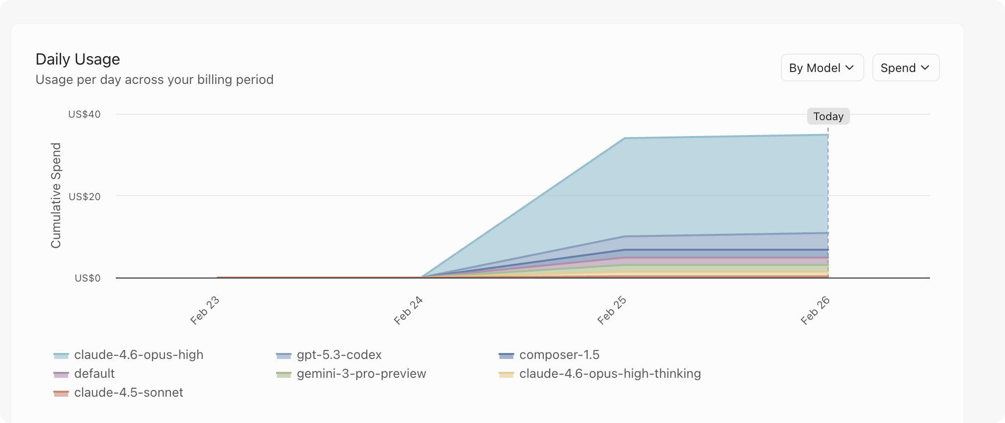 昨天新开通的账号,今天早上起来一看,已经用了$33.04 。 而且大头竟然是 claude-4.6-opus-high ! 这就奇了怪了,昨天开通账号的时候,觉得 4.6-opus 太贵,直接在模型列表中把这个模型关了。所以我无论如何也不可能用到这个模型。