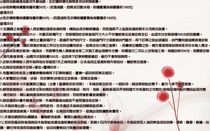 6.大家部分(冷.冰箱.洗衣等)拆箱定位安後,即法退。