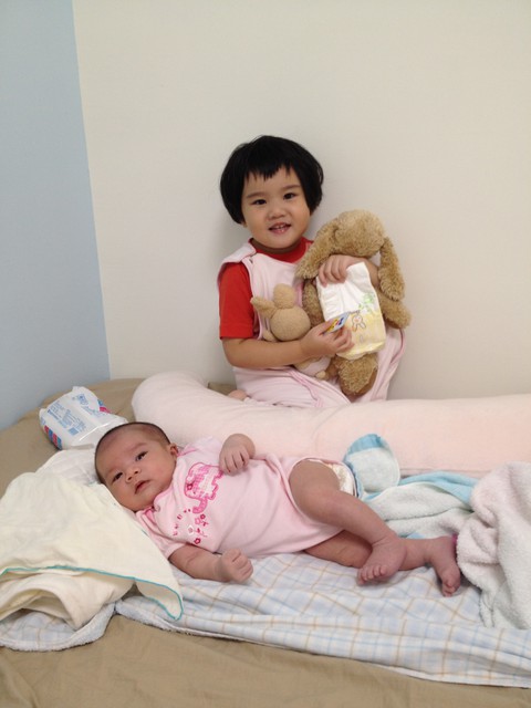 童童不太跟弟弟吃醋,她看著我抱弟弟,她也想抱抱,她跟我:等一下可以抱我?