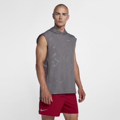 Nike Element 男款無袖跑步連帽上衣採用排汗材質和抽繩連身帽設計,確保穩固不脫落也不會阻礙視線。