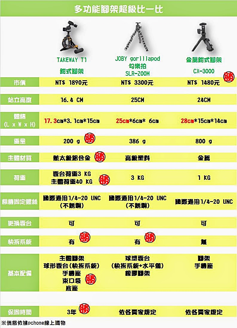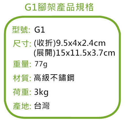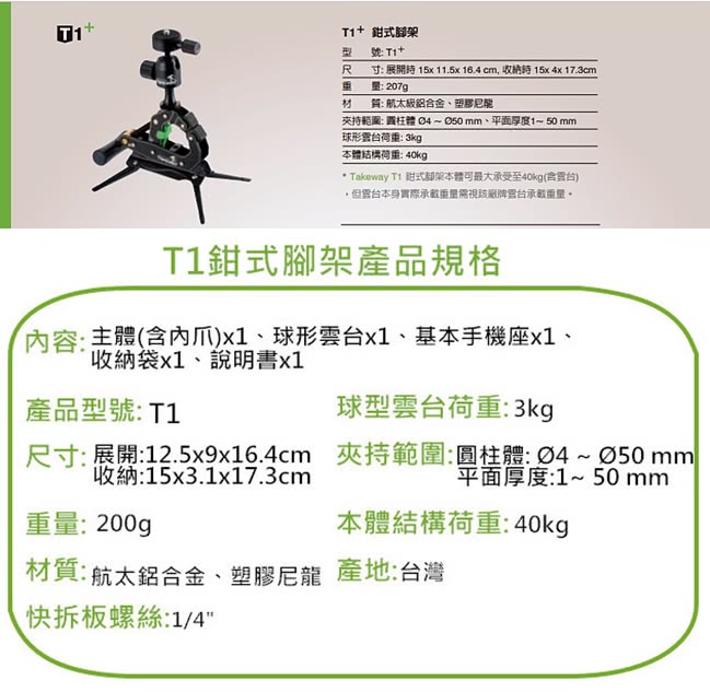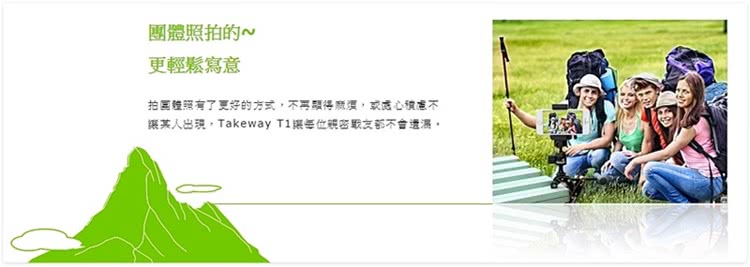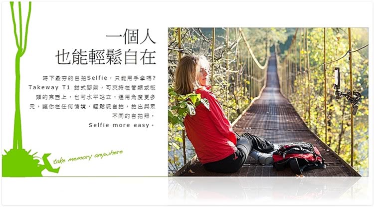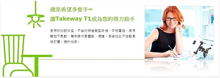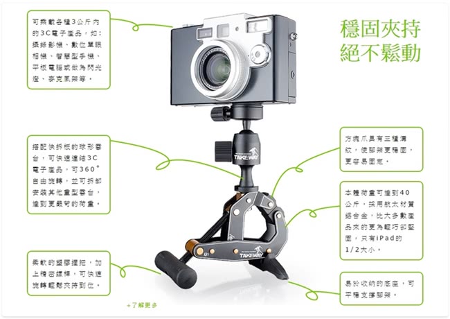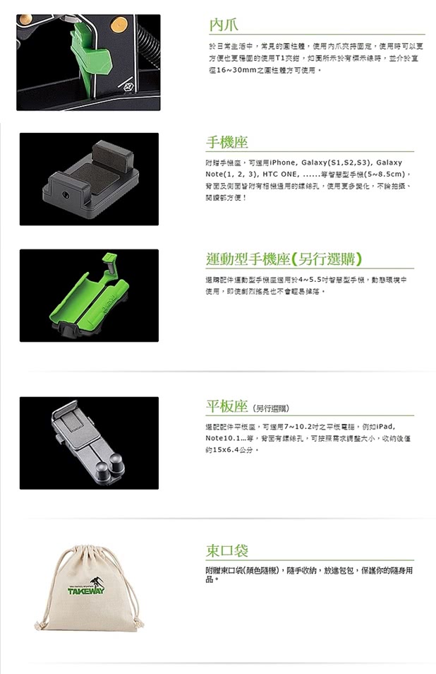 Takeway T1 式架,解了市面上大多便型架,在定性及固定性普遍不足的缺,在量化下,便利又不失其有的功能,Takeway T1 式架提供的持及站立等功能,能易的使用在大多的消性子品,目前流行的智慧型手,增加使用的便利性,造更多的可能;其巧200g,本承力可40KG,可身置於一般小型提包,身在何,都可享受其的便利性。