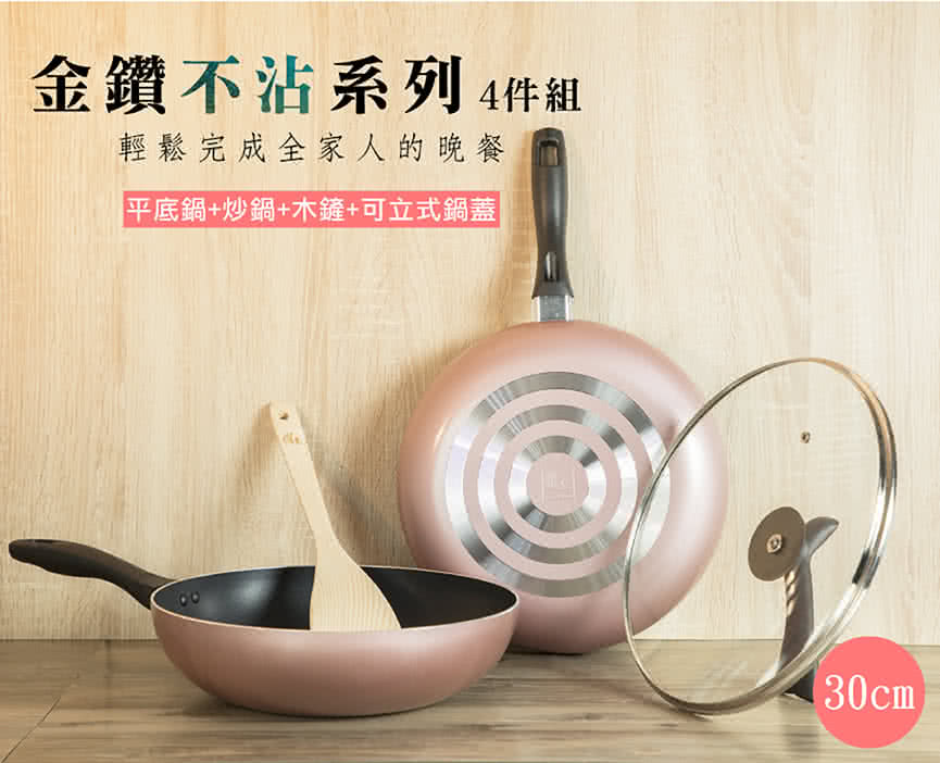 【免】【】金不沾四件-30CM-玫瑰金(30CM炒+30CM平底++木)-手商品@幻天堂|PChome Online 人新台