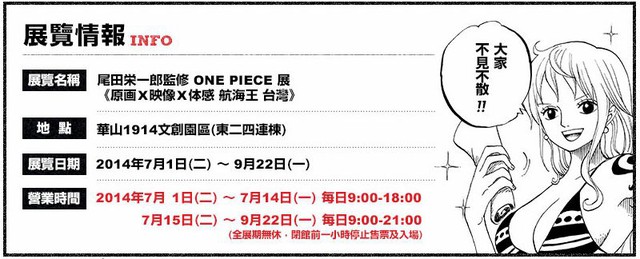 由集英社、多媒、映、ADK及立出版社共同主,『尾田一郎修 ONE PIECE展 《原X映像X感 航海王 台》』7月1日起於山1914文登,在作者尾田一郎的之下,喜漫《ONE PIECE~航海王~》的粉能身到夫一行人至今止的冒。