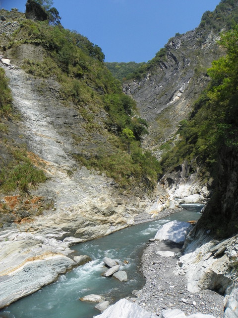 走出入口的隧道,看到瓦黑溪直切而下,溪流旁有河地,太管在河地上有解站;三溪切入立溪的溪口,由於溪流溪床落差大,形成白瀑布,瀑布附近大都是大理岩,有一小部分的矽片岩;最後到第七洞的水濂洞,地下泉著大理岩的理,隧道端而下,形成水濂的特殊景。