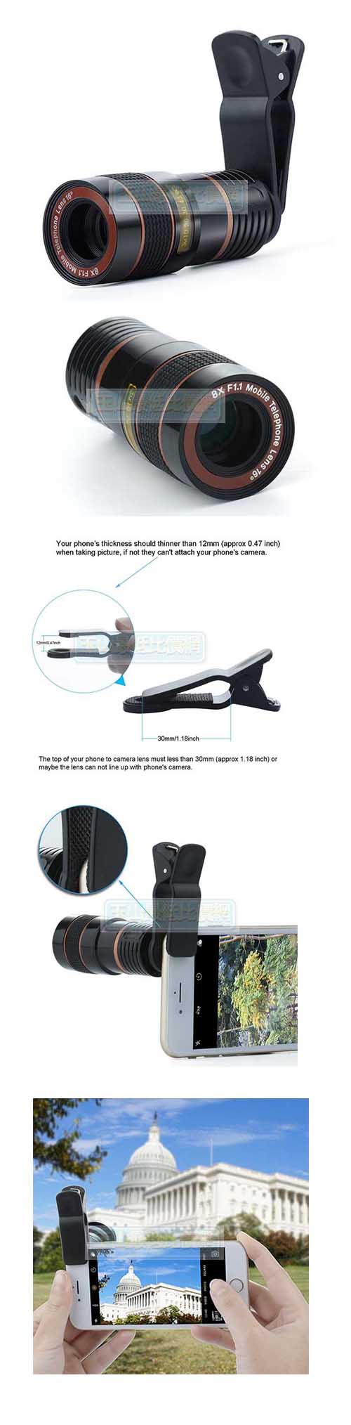 Package include: 1* 8x camera lens, 2* lens caps, 1* universal clip, 1* lens cleaning cloth, 1* user's manual