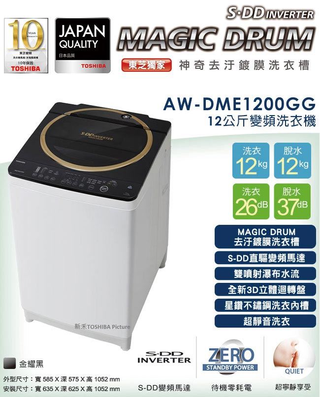 惠必【TOSHIBA 芝】12公斤神奇膜SDD音洗衣 AW-DME1200GG 的品介在下面,