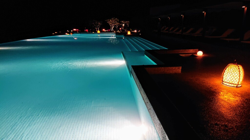 夜晚光下,泳池看起更美了!但,水太冷,也就勇下水了。