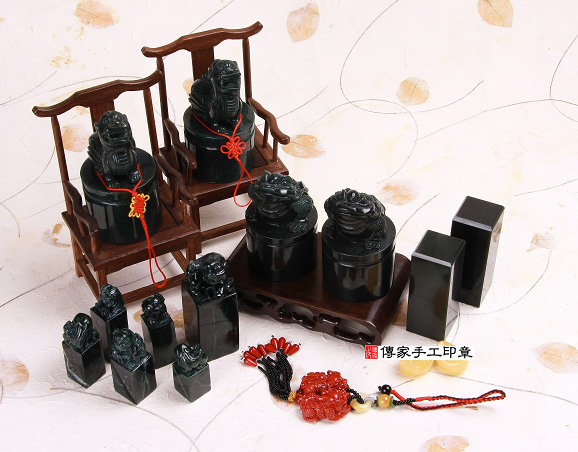 ● 以刻印,因墨玉的硬度很硬,印材法用「篆刻刀」去刻,只能使用手工和作模具,以及用大型砂去型,才能文字刻印在墨玉印章上面。