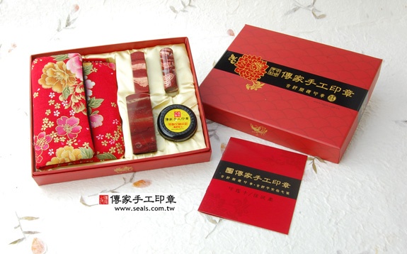 2. 家手工印章━「彩虹玉公司大小印章的成品」。包含: 彩虹玉公司大小印章、全手工印章外出袋、印泥、家手工印章的保、精美中的印章外盒(印盒有四大水神:左青、右白虎、前朱雀、後玄武)。