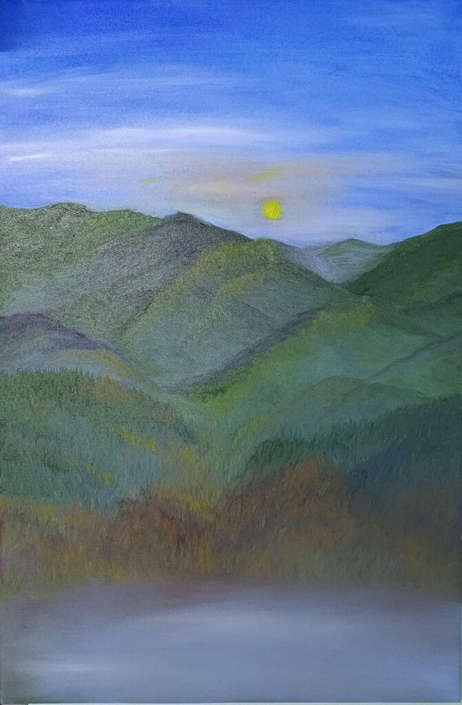 次用想像, 一起陪他走武, 看到美景象的心情. 本很的下午, 也始被日出的璀光暖. 我最喜的天始打底描, 然後意和的色&黑灰料做出的山我了喜.