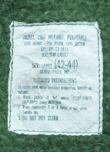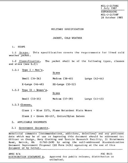 79年75年的相比,摘要如前:全名如75年:Jacket, Cold Weather, Permeable,款是由Vanderbilt Shirt Co., Inc. 所生的。但合的由DSA 100 改成DLA 100.