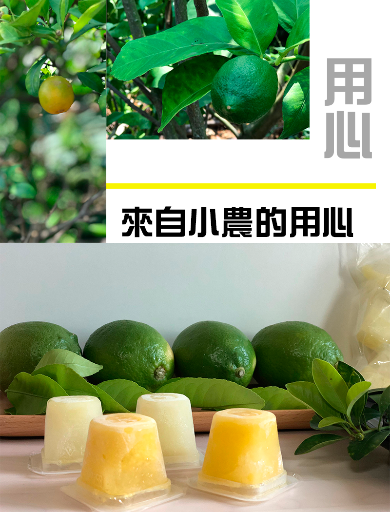 商品息特自小天然水果所成的100%原汁檬冰、100%金桔檬冰,每天方便充天然他命C,原汁也通SGS!