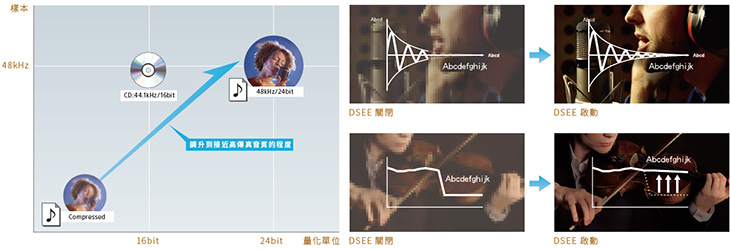 低解析度的路影片,目等位音,失去大量,DESS 技能被的音完原,呈出更真的自然音。 |