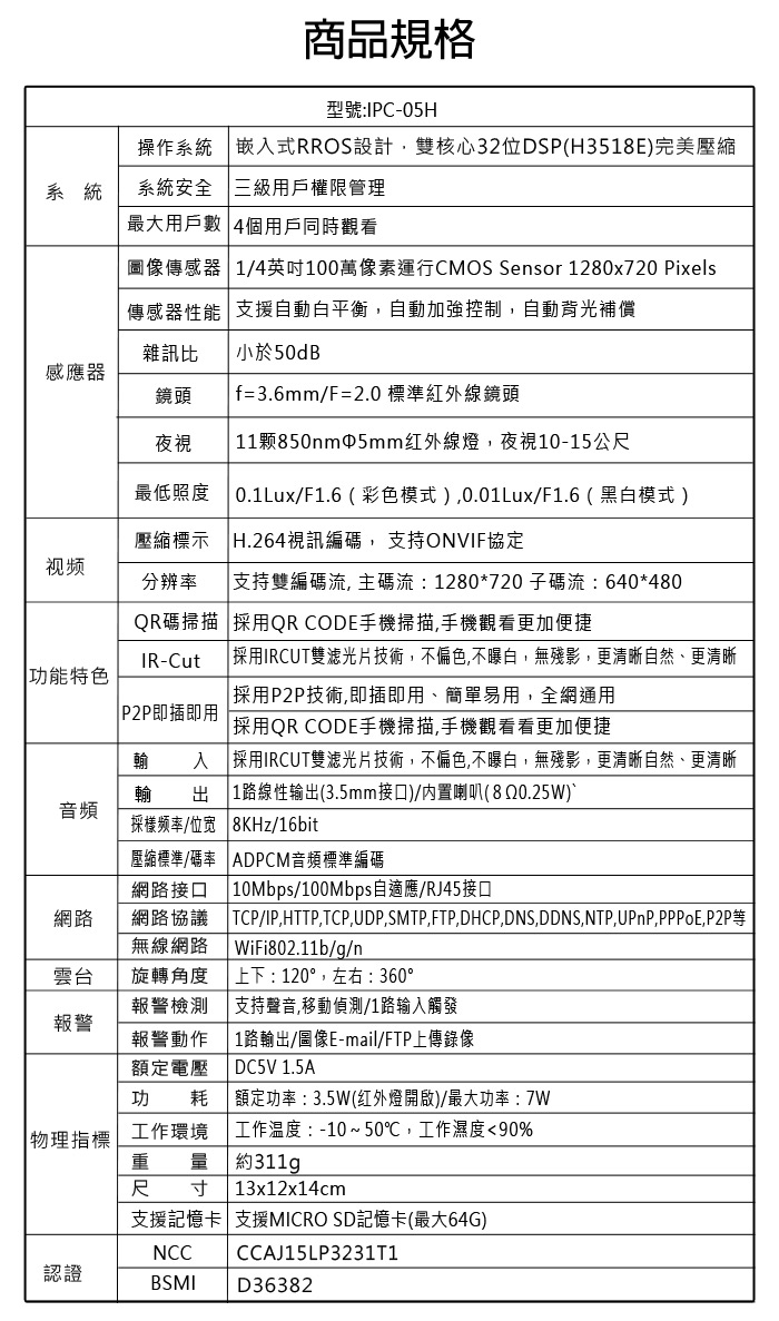★ 高解析人品品HD1280x720P,角度上下120度,左右360度