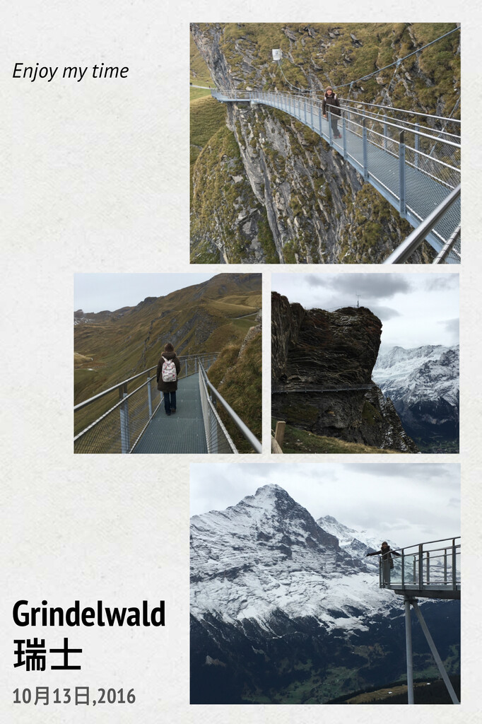 山下搭乘到山需 25 分,我上山是欣景跟健行的,菲斯特山山上有一崖步道 First Cliff Walk, 45 公尺的架空的步道架在山崖,步道上可以不同角度欣面的阿卑斯山群,包括艾格峰的北面,峰雪山峰峰相令人。步道尾端有一向外延伸的景平台,可以近距的山景,也方便客拍照。