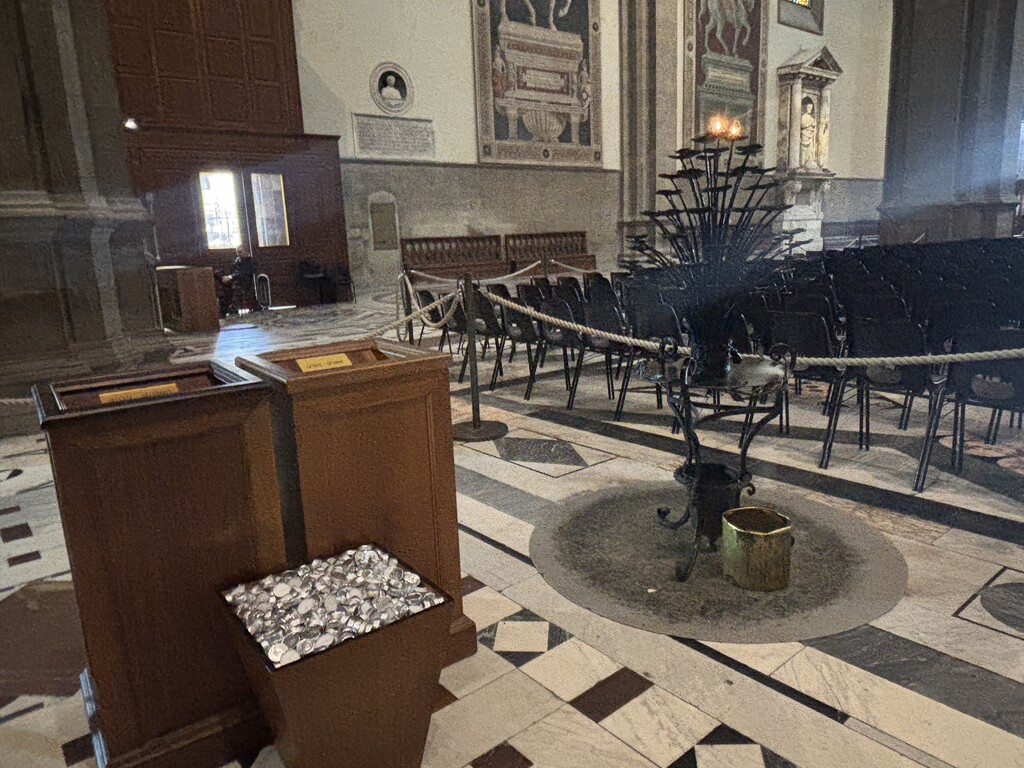 母百花大教堂套票第一天我就用了登、托、主教堂博物和洗堂,剩下雷帕拉教堂。可以母百花大教堂部的梯往地下室票,也可以教堂的用出入口入。而母百花大教堂本身是免的,建至少提前一小到排。 吃早餐之後,逛一下品的之後,有人始排的候,就跟著排,打算把一次看完 雨天晴,光出之後,就那冷…我次佛斯意外的,都短袖的,早晚都比冷,再加上前一天下大雨,更冷。著三天教堂,但是最喜第一天早上拍的照片,光很柔和母百花大教堂是在1296年始,根比(Arnolfo di Cambio)的,重建於西元五世就存在的雷帕拉教堂之(Cripta di Santa Reparate)上。但在比死後位建接手,最後由布雷斯基(Filippo Brunelleschi)於1434年在教堂上立起色八角形大,1436年完工。 到面是需要安的,第一批,有什人,可以快速的拍照,一下子面就的人潮了!很的,有的,一目了然的看到。有晃到~是想拍雕像歪一的子,像是有奈的感教堂必的玻璃花窗,此已不吸引我了! 早上的光很充足,透玻璃照教堂,一切都光台、和捐箱,人的希望所在明明是上的壁,但看起很立,很真教堂的穹、教士的身影和背後的像是地的平台些高高在上的雕像我有一段距,但又有一莫名的切感。古老的管琴陪著大家走人生…悠的音平人心中的不安。像是著百合天使!往上抬可以再次看到人的《最後的判》壁。真的好美,看次都能被感!的,是我外法了解的十字架。得在文期的用色都很,很重,再加上以前有那多工具可以助跟使用。 了一圈,大家把台亮了!其,母百花大教堂面的布置是很的那一,我有一意想不到的喜。 雷帕拉教堂,就是往下去,景就需要票了! 母百花大教堂(Cattedrale di Santa Maria del Fiore) https://duomo.firenze.it/it/homePiazza del Duomo, 50122 Firenze FI, 大利10:15-15:45(日休)