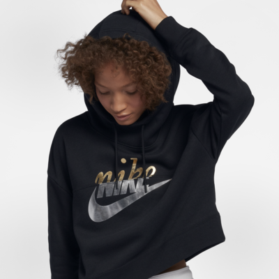 Nike Sportswear Rally 女款金屬色連帽上衣,結合經典標誌圖案與現代金屬感元素。混搭 Nike 兩款最經典標誌線條,結合 1971 原創設計與當代 Nike 標誌。