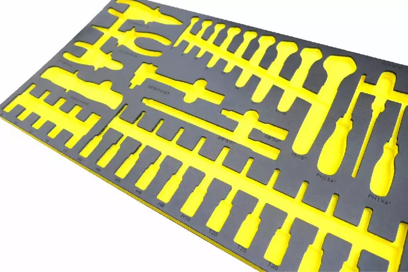 洲知名手工具品牌我司合作多年,指定使用EVA硬度35°材,合CNC精密雕刻程,打造工具箱。不完美包覆各式精密工具,有效震防,通盟RoHS及REACH保,已量供洲多市。