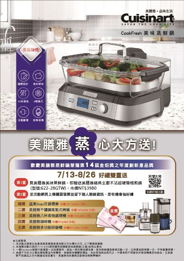 人品品 活日期:7/13~8/26好重送第1重美膳雅美味蒸STM-1000TW即送原典主不沾超硬煎622-28GTW(市$3980)第2重至活上票即有抽好