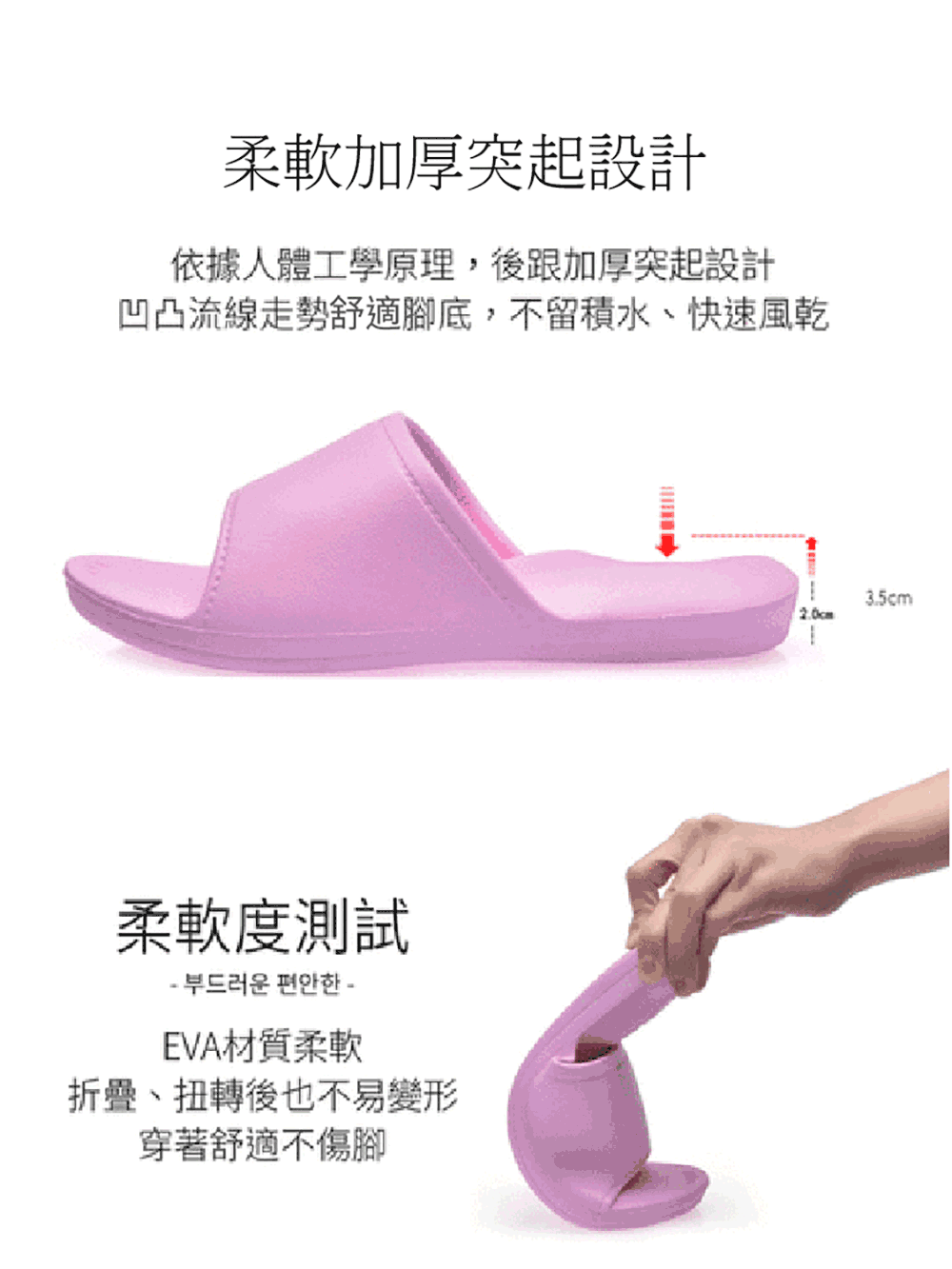 超力加厚用商品推舒拖鞋,一成型,柔性佳,任易曲不形。特殊足供,解行走趾的力。