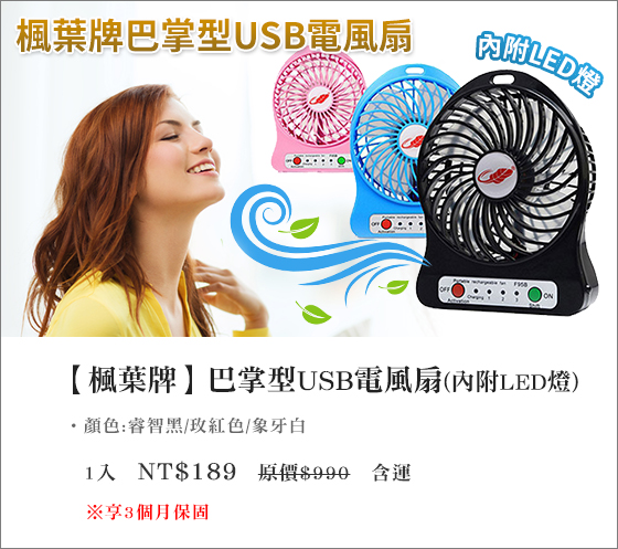 商品息述: 只要189元(含)即可享有【牌】原990元巴掌型USB扇(附LED)1入,色:睿智黑/玫色/象牙白,享3月保固?